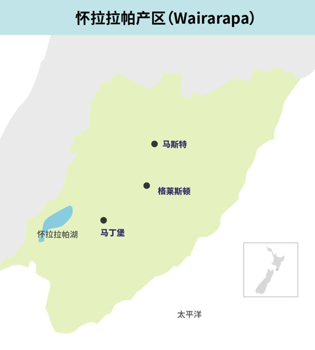 懷拉拉帕位于新西蘭北島的最南端,坐落在該國首都惠靈頓(Wellington)的東部,其名“Wairarapa”在毛利語中意為“閃閃發(fā)光的水域”。懷拉拉帕產(chǎn)區(qū)的葡萄種植面積很小,僅占新西蘭葡萄種植面積的3%,出產(chǎn)的葡萄酒占該國總產(chǎn)量的1%。