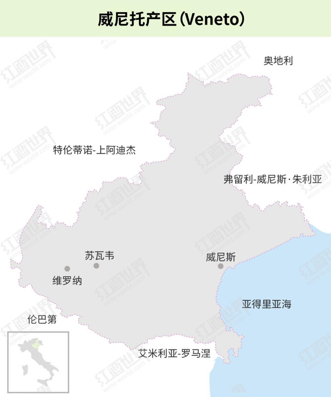 威尼托(Veneto)位于意大利的東北部,以世界知名“水城”——威尼斯(Venice)為首府,坐擁被聯(lián)合國教科文組織(UNESCO)納為世界文化遺產(chǎn)的維羅納(Verona),充滿藝術(shù)和文化的氣息。與此同時(shí),威尼托還是意大利舉足輕重的葡萄酒產(chǎn)區(qū),不僅擁有悠久的釀酒歷史,其獨(dú)具一格的釀酒工藝和多樣化的葡萄酒風(fēng)格也令人印象深刻。