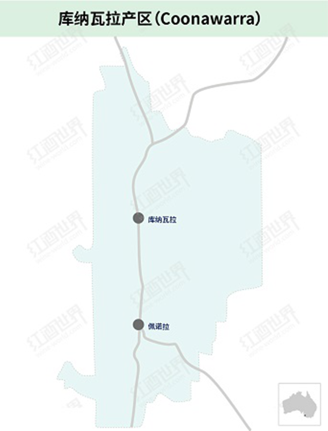 庫納瓦拉產區坐落在南澳州的石灰巖海岸(Limestone Coast)的中心地帶,與維多利亞州(Victoria)比鄰而居,整個產區呈南北狹長狀分布,長約15公里,平均寬度僅有1.5公里,在整個澳大利亞版圖上顯得十分袖珍。不過,這里卻是澳大利亞最古老的葡萄酒產區之一,葡萄種植歷史最早可追溯至1891年。當年,來自蘇格蘭的約翰·瑞多克(John Riddoch)在這片土地上種下了第一批葡萄樹,進而創建了科莫酒莊(Chateau Comaum)??上У氖?,因當地經濟落后,且遠離主要消費群體,該酒莊當時并沒有發展起來。