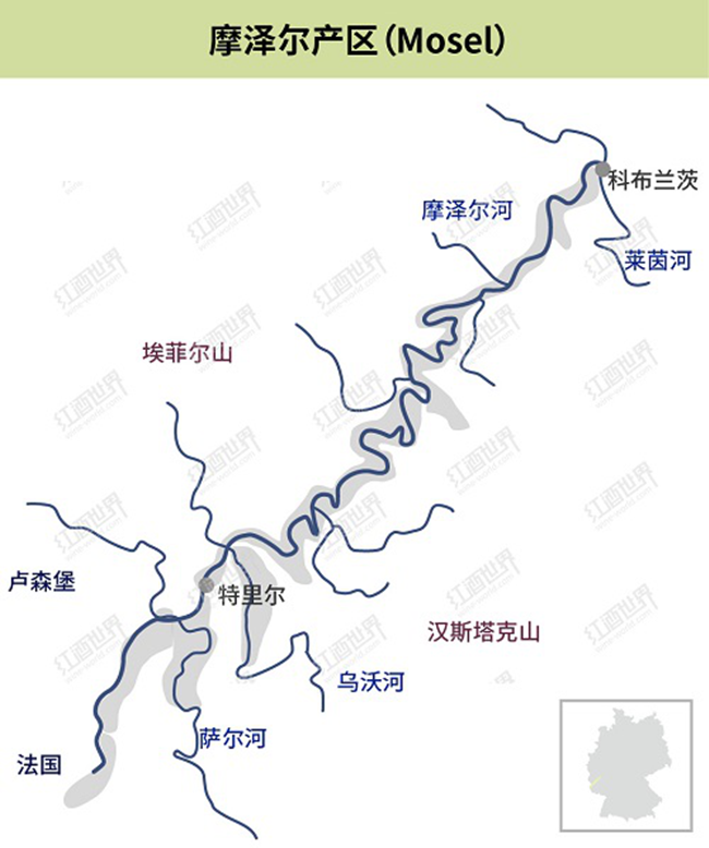 摩澤爾產區包括蜿蜒曲折的摩澤爾河(Mosel River)及其支流薩爾河(Saar River)和烏沃河(Ruwer River)的河谷地區,其名字也來源于摩澤爾河。摩澤爾產區的葡萄園主要位于河谷兩岸的陡坡上,是世界上最陡峭的葡萄種植地區之一,坡度最大處可達70°。陡峭的坡度造成作業的困難,幾乎所有的勞作都必須由人工完成,包括將每棵葡萄樹固定在木樁上,以及搬運被冬雨沖走的板巖土壤。