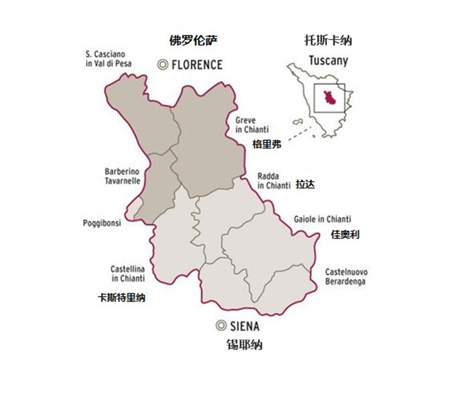 經典基安帝產區地處托斯卡納(Tuscany)大區中部的佛羅倫薩市(Florence)與錫耶納市(Siena)之間,總占地7萬余公頃,在行政區域上涉及9個市鎮,涵蓋了拉達(Radda in Chianti)、佳奧利(Gaiole in Chianti)、卡斯特里納(Castellina in Chianti)和格里弗(Greve in Chianti)這四個市鎮的全部地域以及其余5個市鎮的部分地域。