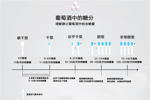 國際上還有一種通用的量化方法,那就是用勺數(shù)來表示,詳見下圖。一個(gè)標(biāo)準(zhǔn)勺為 1 盎司(約等于 28.35 克),如下圖所示,干型的殘?zhí)橇糠秶恍蜗蟮谋硎緸?0 勺到 1/3 勺之間,近乎干殘?zhí)橇康姆秶槐硎緸?1/3 勺至1勺+之間。