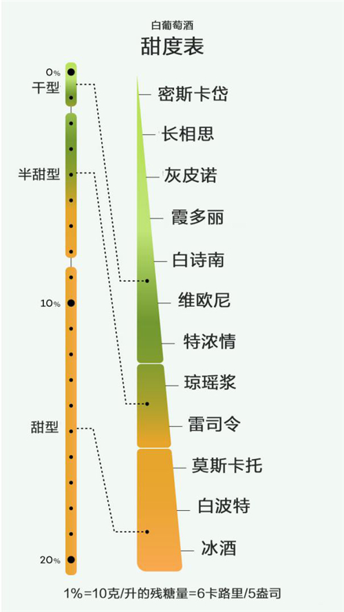 白葡萄酒中,密斯卡岱、長相思(達(dá)格諾酒莊絲萊克白)、灰皮諾、霞多麗(默爾索酒莊白)和白詩南葡萄酒通常被釀成干型的風(fēng)格,維歐尼、特濃情(比薩諾酒莊家族白)和瓊瑤漿(圣雷米埃連維園老藤干白)葡萄酒通常被釀成近乎干型的風(fēng)格,而雷司令葡萄酒、莫斯卡托葡萄酒、白波特和冰酒則通常被釀成甜型的風(fēng)格。