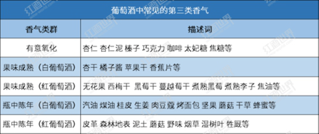 而在瓶中陳年的葡萄酒接觸到的氧氣極為有限,此類葡萄酒中原有的第一、第二類香氣則會轉化成汽油、蜂蜜、干草、泥土和蘑菇等第三類香氣。以紅葡萄酒為例,經瓶陳后,赤霞珠(Cabernet Sauvignon)和梅洛(Merlot)會發展出干煙草和雪茄盒的香氣,西拉(Syrah)展現出煙熏、腌肉以及紫羅蘭的特點,內比奧羅(Nebbiolo)和桑嬌維塞(Sangiovese)轉向以酸櫻桃和玫瑰的香氣為主,而黑皮諾(Pinot Noir)則發展出落葉、泥土和森林地表等第三類香氣。