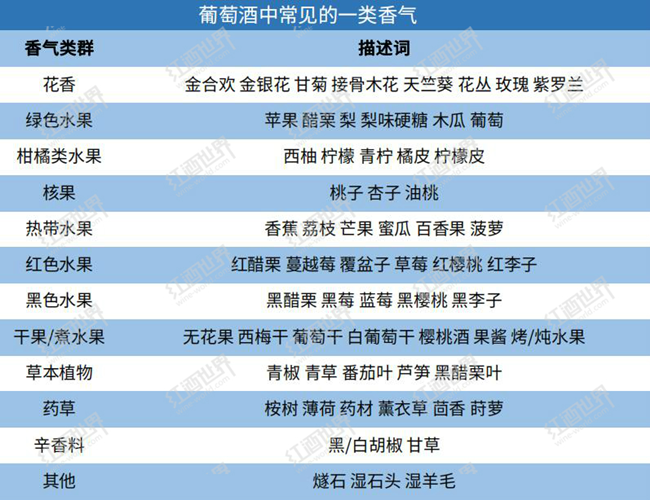 葡萄酒的一類香氣為葡萄品種自帶的香氣和酒精發(fā)酵過程中產(chǎn)生的香氣,主要表現(xiàn)為葡萄酒中各類新鮮的花香、果香和草本香氣等,這些香氣在不同產(chǎn)區(qū)的氣候條件下也會(huì)展現(xiàn)出不同的側(cè)重點(diǎn)。一款簡(jiǎn)單易飲的葡萄酒通常只會(huì)展現(xiàn)出有限的一類香氣,且往往都是來(lái)自同一類群的香味,如熱帶水果香氣或者柑橘類果香。而一款復(fù)雜的葡萄酒通常會(huì)展現(xiàn)出不同類群的香氣,如同時(shí)帶有紅色水果、黑色水果和草本植物的香氣。