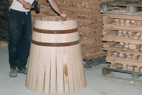 經過干燥的橡木,裁成中間寬末端窄的木條,便可開始木桶的組合。一般一個橡木桶需要32片左右的木條,其中較寬的一塊將來會穿一個裝酒的孔。組成裙狀的木條會先用鐵圈固定住一端。由于橡木加熱之后彈性增加,所以散開的另一端在加熱后可以彎曲成弓狀,用鐵圈套住后橡木桶的雛形就大致完成。