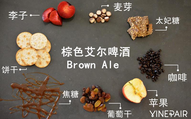 棕色艾爾啤酒含多種水果味,如蘋果、李子、葡萄干,在焦糖氣息的烘托下,其口感非常圓潤柔順。與波特啤酒和司陶特啤酒類似,棕色艾爾啤酒帶有咖啡、麥芽和烤餅干的味道。