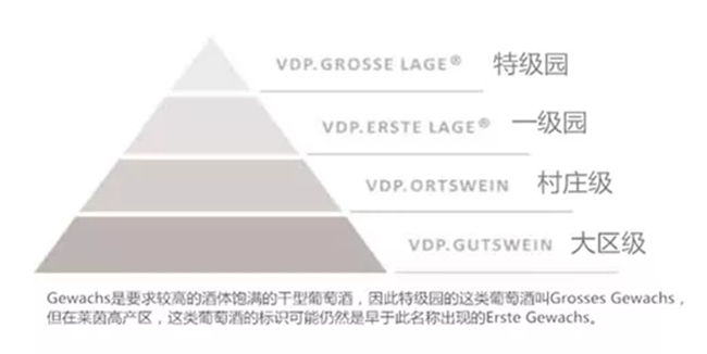 現(xiàn)在越來(lái)越能代表德國(guó)雷司令葡萄酒級(jí)別的是德國(guó)名莊聯(lián)盟(Verband Deutscher Pradikatsweinguter,簡(jiǎn)稱VDP)倡導(dǎo)的針對(duì)葡萄果實(shí)天然特性進(jìn)行的分類,即好葡萄酒不應(yīng)該只擁有足夠高的潛在酒精度,還應(yīng)該具有一定的原產(chǎn)地和其他方面的特色。