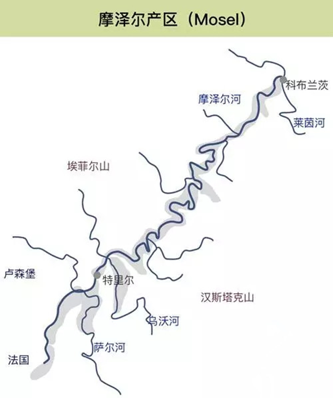 摩澤爾產(chǎn)區(qū)的名字以前是摩澤爾-薩爾-烏沃(Mosel-Saar-Ruwer),但為方便消費(fèi)者記憶,后改稱為摩澤爾。摩澤爾氣候涼爽,葡萄品種以雷司令為主,出產(chǎn)全世界最精美也是最為昂貴雷司令葡萄酒的伊貢米勒酒莊就坐落著這里。此外,露森酒莊(Dr. Loosen)、普朗酒莊(Weingut Joh.Jos.Prum)和瑪斯莫麗酒莊(Markus Molitor)也是摩澤爾地區(qū)的優(yōu)秀名莊。