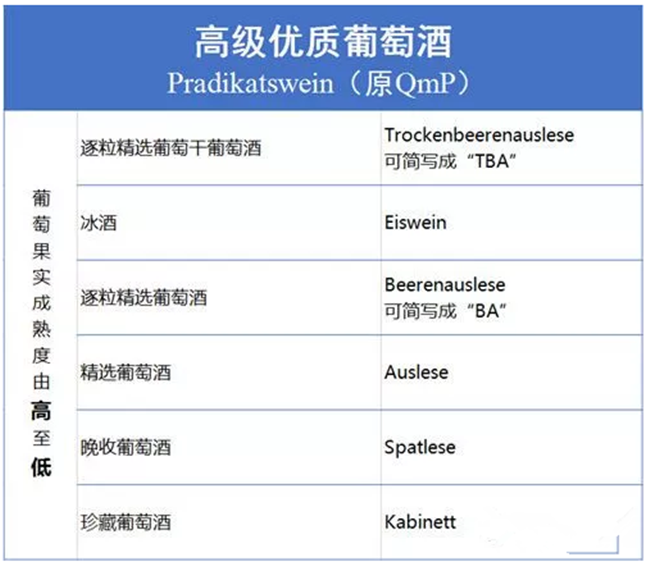 德國(guó)與歐洲其他國(guó)家最明顯的不同是對(duì)最高級(jí)別的葡萄酒又根據(jù)葡萄果實(shí)的成熟度進(jìn)行了細(xì)分