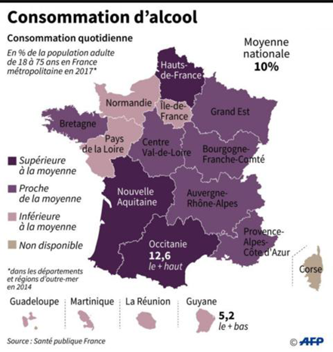 該機(jī)構(gòu)指,法國(guó)成年人每日飲酒比例達(dá)10%,巴黎大區(qū)、諾曼底、盧瓦爾地區(qū)以及海外領(lǐng)地居民低于平均值,奧克西塔尼大區(qū)(12.6%)、新阿基坦大區(qū)(12.3%)和上法蘭西大區(qū)(11.5%)居前三位。