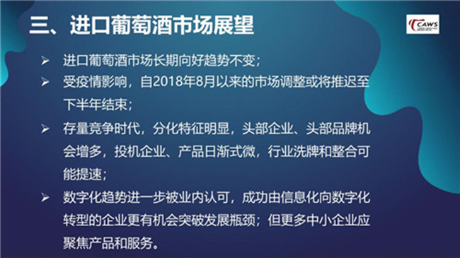 在今年,雖然疫情延長了市場調整期,但國內經濟韌性十足、防控工作及時到位,在年底或明年初,葡萄酒市場會逐步邁入佳境。對于進口葡萄酒而言,向好的趨勢不會改變。值得一提的是,隨著國家經濟增速的減緩,進口葡萄酒市場轉變為存量市場的情況越發明顯,一個顯著熱點就是分化,頭部企業的機會增多,投機企業、產品日漸式微,行業洗牌和整合可能提速。