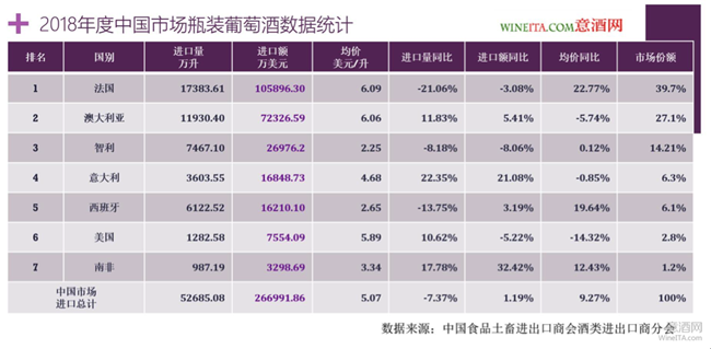 排名第二的法國(guó)瓶裝葡萄酒進(jìn)口總量為13734.83萬(wàn)升,進(jìn)口總額為6.8449億美元,相比2018年分別下降20.99%和35.09%。進(jìn)口均價(jià)為4.98元/升,相比2018年下降了19.69%,占據(jù)了29.90%的市場(chǎng)份額。對(duì)比2018年占據(jù)39.7%的市場(chǎng)份額,跌幅超過(guò)25%。