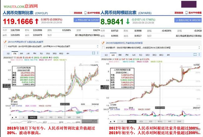 意酒網(wǎng)搜索了人民幣對(duì)主要葡萄酒生產(chǎn)國(guó)的匯率。發(fā)現(xiàn)2019年以來(lái),人民幣對(duì)美元和歐元匯率一直在正負(fù)4%的幅度內(nèi)波動(dòng)。但是從2017年初至今,人民幣對(duì)阿根廷比索的匯率升值達(dá)到300%,從2019年初至今,人民幣對(duì)阿根廷比索的匯率升值達(dá)到200%。原來(lái)時(shí)因?yàn)閰R率的大幅度波動(dòng),導(dǎo)致阿根廷葡萄酒的進(jìn)口價(jià)格大幅度下跌。這種匯率變動(dòng),短期看對(duì)阿根廷葡萄酒價(jià)格有利,但是從長(zhǎng)期看,阿根廷葡萄酒蘊(yùn)含較大風(fēng)險(xiǎn)。