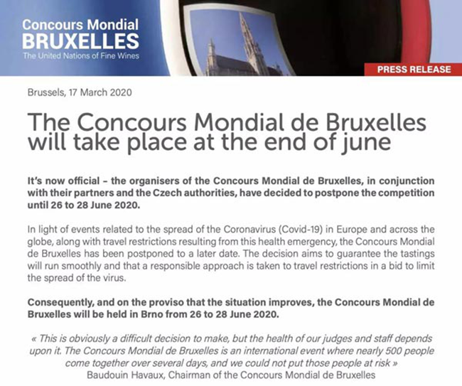 鑒于上述考量,2020年比利時布魯塞爾國際葡萄酒大獎賽將延期至6月26日-28日在捷克布爾諾舉辦。