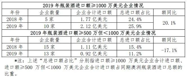 近兩年,頭部企業對澳洲酒的持續加碼對進口葡萄酒市場格局起到了頭雁效應。澳洲瓶裝酒進口頭部企業(指進口額≥500萬美元以上的企業)隊伍有所壯大,且進口額呈正向增長(5.6%):其中,2019年進口額≥1000萬美元的10家企業中9家實現同比增長,僅1家同比下降;進口額≥500萬美元的13家企業中9家實現同比增長,4家同比下降。