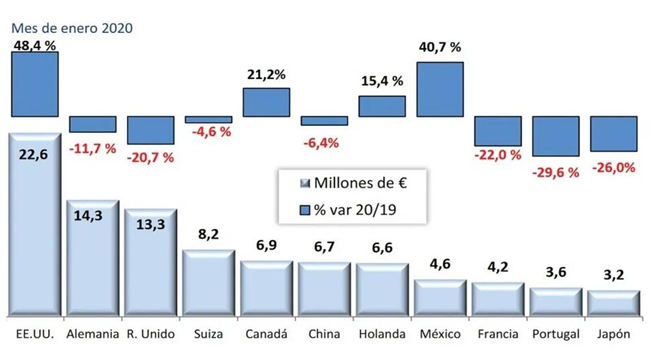 根據西班牙葡萄酒市場觀察(OeMV)提供的數據,在2020年的第一個月,西班牙葡萄酒出口的平均銷售價格上漲7.5%,達到1.26歐/升,這使得銷售額的下降幅度低于出口量(銷售額下降1.3%,出口量下降8.1%)。