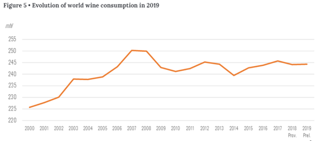 2019年世界葡萄酒消費量估計為244 百萬升,與2018年相比增加了0.1%。