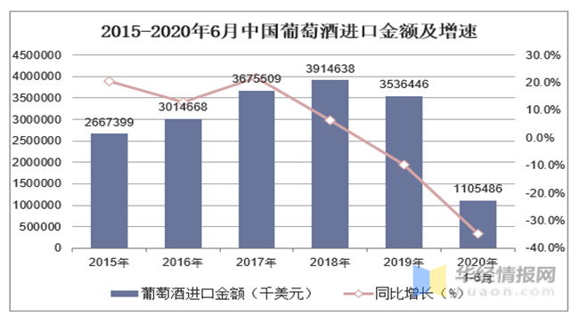 華經產業研究院數據顯示:2020年1-6月中國葡萄酒進口數量為22909萬升,相比上年同期減少了10638.1萬升,降幅為31.7%;進口金額為1105486千美元,相比上年同期減少了588716千美元,降幅為34.8%;2020年1-6月中國葡萄酒進口均價為48.26千美元/萬升。
