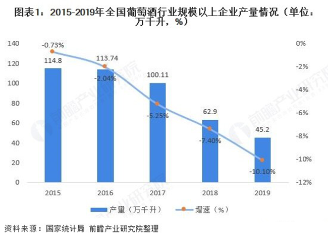 我國葡萄酒在經歷了高速發展后自2013年進入結構性調整期,近年來行業產量、營業收入和利潤總額均呈現不同程度的下滑。在產量方面,為尋求供需平衡,行業持續降產,2019年全國葡萄酒行業規模以上企業實現葡萄酒產量45.2萬千升,同比下滑10.1%。