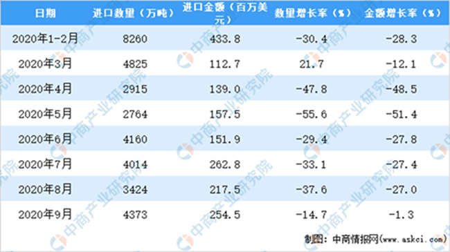 數(shù)2020年1-9月中國(guó)葡萄酒進(jìn)口量及金額增長(zhǎng)情況