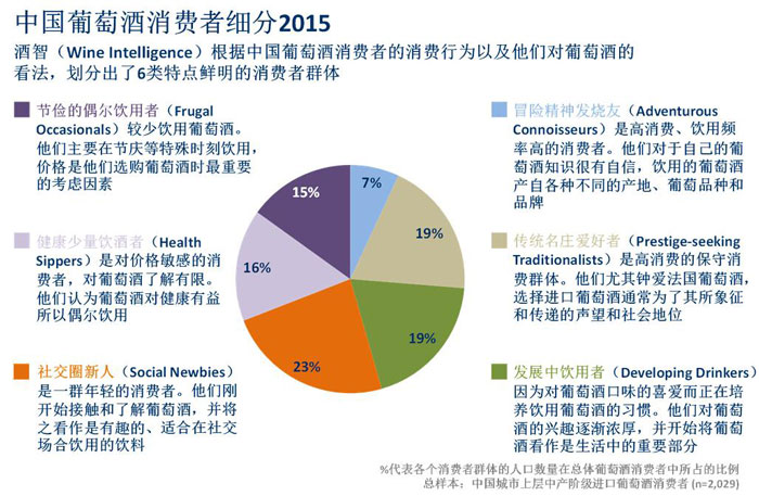 針對(duì)中國(guó)的3800萬(wàn)進(jìn)口葡萄酒消費(fèi)者,酒智(Wine Intelligence)劃分出了6類(lèi)特點(diǎn)鮮明的消費(fèi)者類(lèi)別。除了上述提及的 “發(fā)展中飲用者”(Developing Drinkers),其他5類(lèi)包括“冒險(xiǎn)精神發(fā)燒友”(Adventurous Connoisseurs)、“傳統(tǒng)名莊愛(ài)好者”(Prestige-seeking Traditionalists)、“社交圈新人”(Social Newbies)、“健康少量飲酒者”(Health Sippers)和“節(jié)儉的偶爾飲用者”(Frugal Occasionals)。酒智(Wine Intelligence)的消費(fèi)者劃分不僅基于年齡、性別和收入等基本信息,還涉及消費(fèi)者的購(gòu)買(mǎi)飲用行為以及他們對(duì)于葡萄酒的看法,包括:他們?yōu)楹物嬘闷咸丫疲绾巫龀鲑?gòu)買(mǎi)決定,以及飲用何種葡萄品種和產(chǎn)地等等。