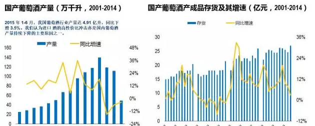 回顧國產葡萄酒的發(fā)展,在經歷近十年產量年均17%的高速增長后,2012年到達頂峰;行業(yè)收入在2001-2012年間年均復合增速達23%;2013年,經濟維持低景氣,“三公消費”限制加劇,行業(yè)量價齊跌,處于景氣低谷;同時產成品同比增速額和庫存壓力處于歷史高位,產量、行業(yè)收入和利潤均出現大幅下滑。但經過2014年的庫存消化,行業(yè)產成品存量增速逐步放緩,產量下降速度也開始減緩,收入和利潤出現回升。