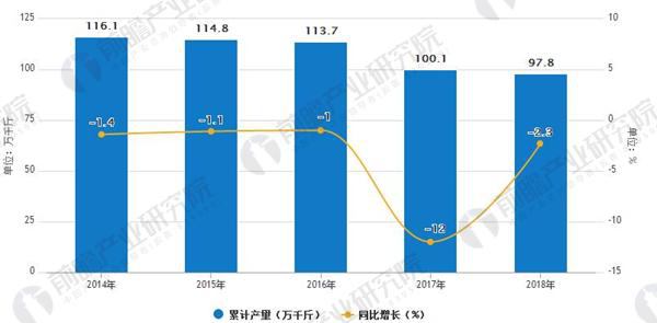 具體來看,2016年全國葡萄酒產(chǎn)量達113.7萬千升,同比下滑1%。預(yù)計2018年中國葡萄酒產(chǎn)量將下滑至107.2萬千升。