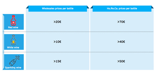該報告的研究主體是“Top Wines”,也就是那些在餐飲渠道中,批發(fā)價格高于每瓶20歐元,零售價格高于每瓶70歐元的紅葡萄酒;批發(fā)價格高于每瓶10歐元,零售價格高于每瓶40歐元的白葡萄酒和批發(fā)價高于每瓶15歐元,零售價高于每瓶50歐元的起泡酒。