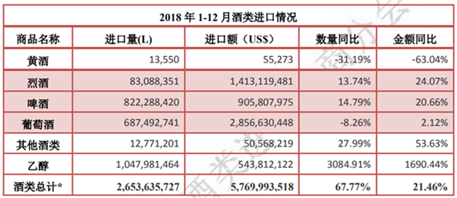2018 年 1-12 月,進口酒類市場整體繼續上行,量額齊升,增幅擴大,這主要得益于烈酒、啤酒以及其他酒類的增長,三者量額均保持兩位數增長,葡萄酒量額漲跌互現,黃酒量額齊跌。