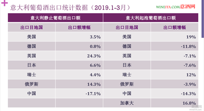 具體到不同市場,2019年第一季度,意大利靜止酒對英國的出口額迎來的爆發(fā)式增長,同比去年上升了24.3%。同期,意大利靜止酒對其他國家的出口額也都有不同程度的增長,其中對美國出口額增長了3.5%,對德國出口額增長了0.8%,對日本出口額增長6.6%,對瑞士出口額增長了4.4%,對俄羅斯出口額增長了14.3%。而對中國市場,意大利靜止酒的出口額同比上年減少了17.1%。