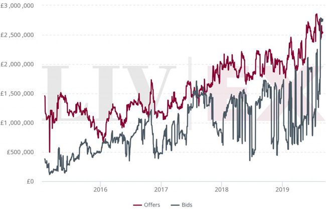 如上圖所示,早于2015年,意大利的出價(jià)和報(bào)價(jià)總值已接近200萬(wàn)英鎊。 現(xiàn)在,這數(shù)字更已超過(guò)500萬(wàn)英鎊,很大程度上是由活躍買(mǎi)家所推動(dòng); 由此可反映市場(chǎng)對(duì)意大利葡萄酒的興趣日增。