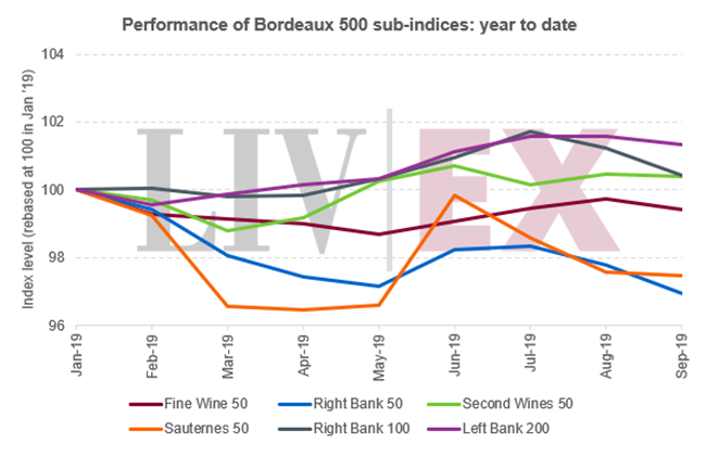 本年至今,波爾多的表現(xiàn)好壞參半。在其分項(xiàng)指數(shù)中,右岸50跌幅最大(-3.1%),緊隨其后的是蘇玳 50(-2.5%)。