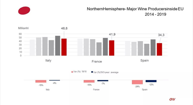 OIV工作人員對媒體表示,2019年全球葡萄酒減產的主因是“氣候災害”。很多產區經歷了寒冷多雨的春天與極度炎熱干燥的夏天,葡萄產量減少。