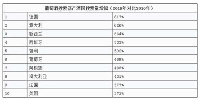 在2010年,前25大葡萄酒產(chǎn)酒國每月合計擁有360萬次搜索。在2019年,該數(shù)據(jù)為1505萬次,增長了430%。