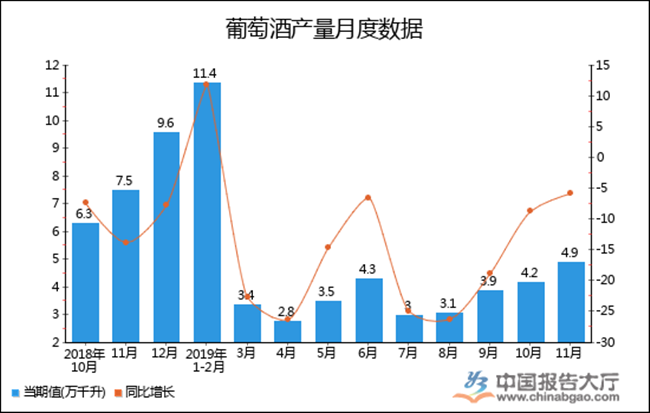 根據中國報告大廳對2019年1-11月全國葡萄酒產量進行監測統計顯示:2019年11月全國葡萄酒產量4.9萬千升,同比下降5.8%,2019年1-11月全國葡萄酒產量為37.2萬千升,累計下降12.1%。