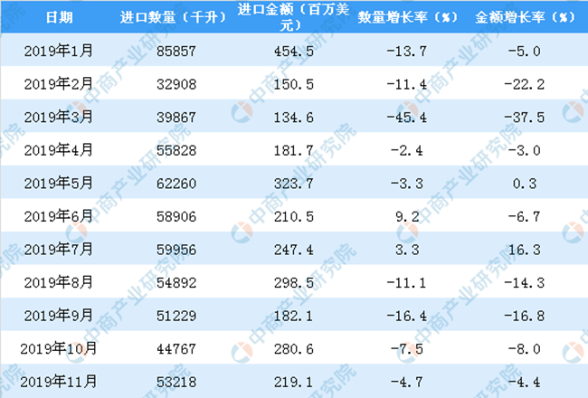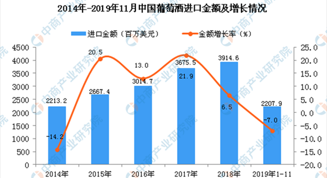 從金額方面來(lái)看,2019年1-11月中國(guó)葡萄酒進(jìn)口金額為2207.9百萬(wàn)美元,同比下降7%。