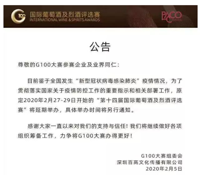 日前,G100大賽組委會以及深圳百高文化傳播有限公司發出公告,原定于在2月27-29日開始的“第十四屆國際葡萄酒及烈酒評選賽”也將延期舉辦,具體舉辦時間將另行通知。
