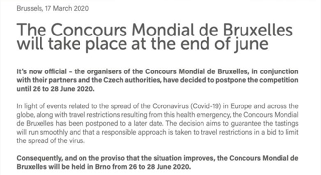 • 針對目前流行的Covid-19新型冠狀病毒對于全球的影響,在經過組委會與主辦地的積極協商后,現決定“2020(捷克·布爾諾)比利時布魯塞爾國際葡萄酒大獎賽”將延期至2020年6月26日至28日舉辦。同時,為了緩解報名企業的物流運輸壓力,全球樣品征集截止時間也將適...